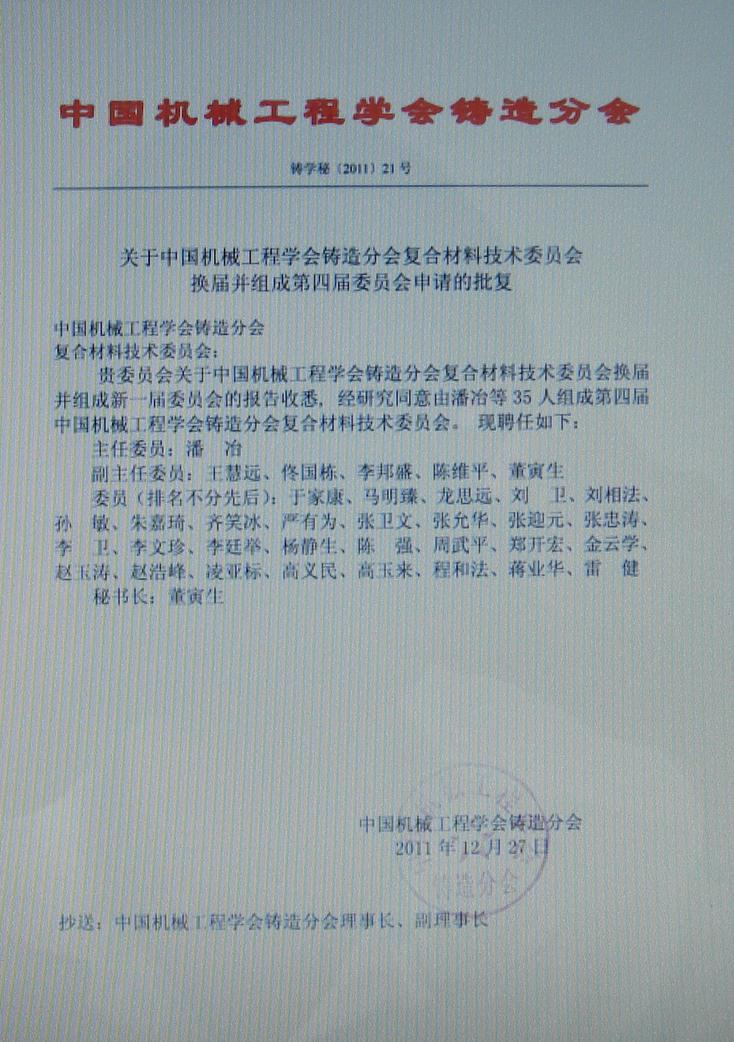 復(fù)合材料技術(shù)委員會(huì)年會(huì)通知[2013/10/29] 各位委員: 您們好! 復(fù)合材料技術(shù)委員會(huì)定于2013年8月14~17日在甘肅蘭州第八屆全國(guó)鑄造復(fù)合材料學(xué)術(shù)會(huì)議期間召開(kāi)復(fù)合材料技術(shù)委員會(huì)工作會(huì)議,請(qǐng)各位委員按時(shí)參會(huì)。謝謝! (本次會(huì)議的相關(guān)安排已于5月23日和7月22日兩次發(fā)送電子郵件進(jìn)行通知,需要的委員可以查收您的信箱。如未收到郵件,請(qǐng)與我聯(lián)系。) 附件是新一屆復(fù)合材料技術(shù)委員會(huì)的名單,請(qǐng)各位委員注意查收。 ![]() 相關(guān)新聞![]() |